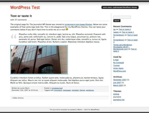 Journalist by kalphegor is a smart, clean and classic, minimalist theme designed for professional journalists. It features 2 columns, a right sidebar and fixed width and is widget ready. Theme homepage: http://lucianmarin.com/page/themes/
